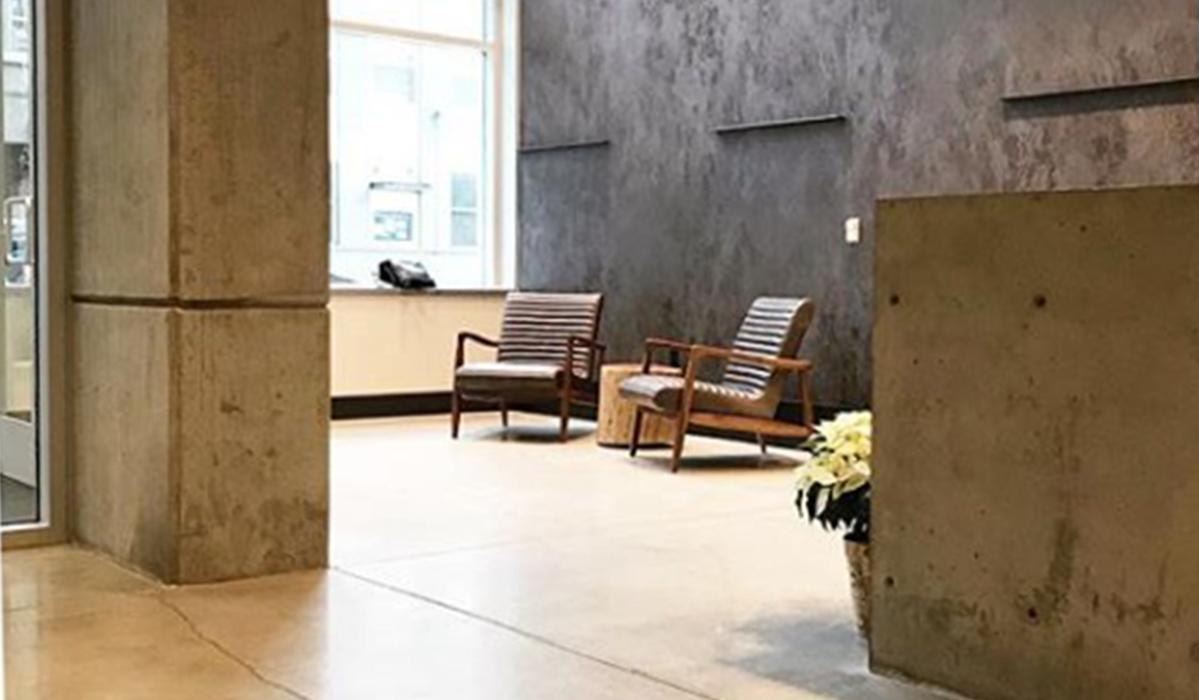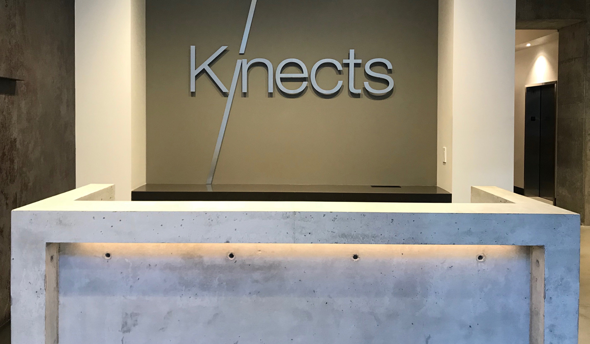 In leading the interior design concept at Kinects Tower, Bumgardner ensure the entrance and main lobby mimic the exterior of the sloping walls and full height glass to maximize the views and light. Throughout this area, slanted concrete columns and exposed structural concrete create focal points in color and texture. In contrast, natural wood on accent walls and custom artwork help establish an inviting, residential feeling.