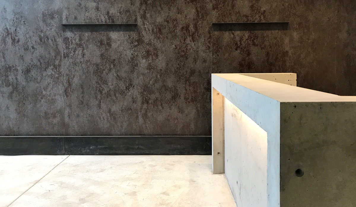 With two story spaces and large expansive windows in the lobby, the Bumgardner designers needed to bring in some warmth and texture. The main lobby wall is more than 20’ high by 30’ wide, so the team chose Crossville Porcelain Tile Panels by Laminam Blend collection in the Nero colorway. Nero’s style and appearance beautifully blend with the raw, industrial style of the building’s aesthetic. The panels’ extremely large format (with outer dimensions measured in feet, not inches), its relative light weight (thanks to its lean profile), and ease of installation all served as advantages for the distinctive space. The designers punctuated the tile installation by adding a series of horizontal, natural steel angles that complemented the tile’s metallic colorations. The panels were installed with a minimal grout joint, thus the wall appears to be one continuous plane. The steel adds an industrial look to the installation.