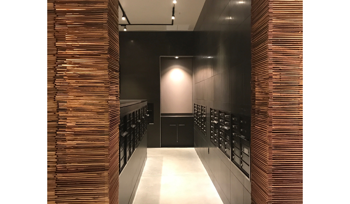 The sophisticated warm grey color palette is complimented by the tile’s natural pattern and texture which give the lobby and concierge area a comfortable but chic vibe. The Nero panels have just a hint of rusty orange that moves through the surface visual and picks up the light. It coordinates elegantly with the art installation that is adjacent to the tile wall in the residential lobby.