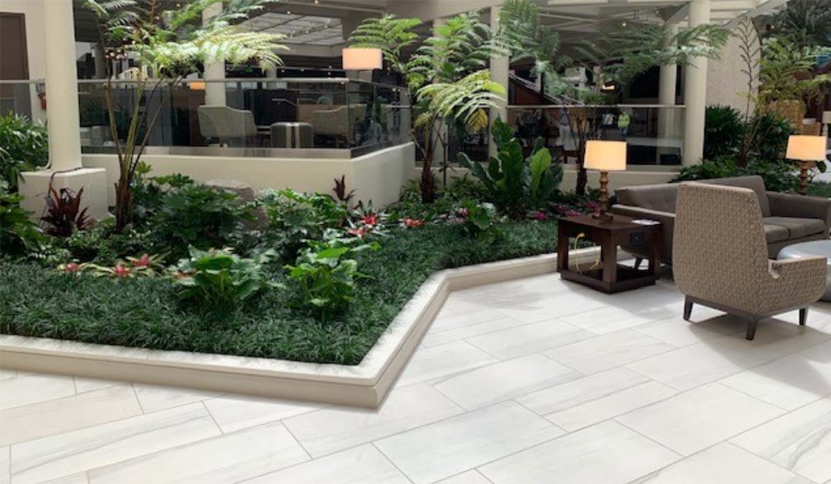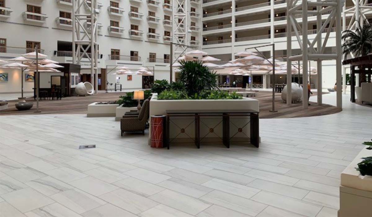 The replacing of lobby flooring in any open and operating hotel is no small feat. The process can be disruptive and off-putting for staff and guests alike. The challenges are compounded for a hotel the size and scope of Renaissance Orlando, as its atrium lobby encompasses a vast amount of surface area and serves as a major focal point for the entire facility. The team behind this project thoughtfully planned and considered all aspects of specification and installation to ensure as smooth a process as possible with exceptional results in terms of the chosen flooring’s style and performance.