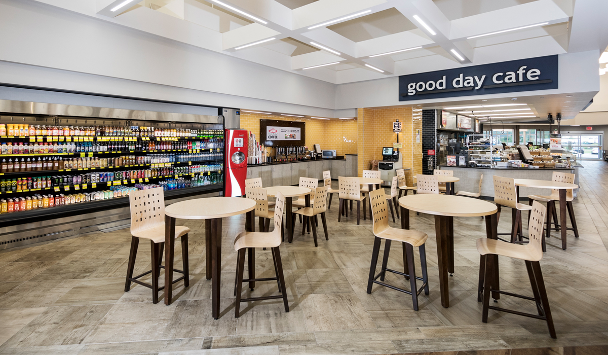 Reclamation is again utilized in the store’s Good Day Café, where sleek, modern-style white chairs and tables offer juxtaposition to the warm tone of the porcelain tile. The space is an oasis within the store, offering shoppers a place to relax and enjoy a drink or meal from the store’s prepared food section.