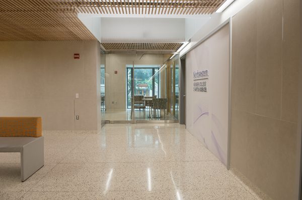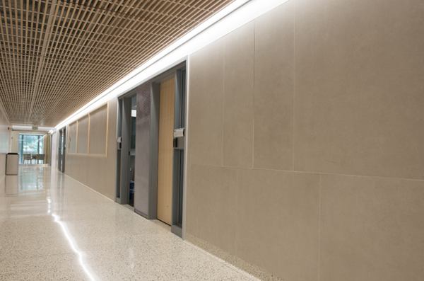 The innovative gauged porcelain tile panels contribute to the desired ‘high-end loft office’ aesthetic of spaces throughout the hall. The tile’s sophisticated appeal fits right in with the hall’s exposed structure and systems, including open ceilings and clerestory lighting, exposed duct-work, and chilled sails. All materials and design details work in harmony, making the project both visually and technically open and durable.