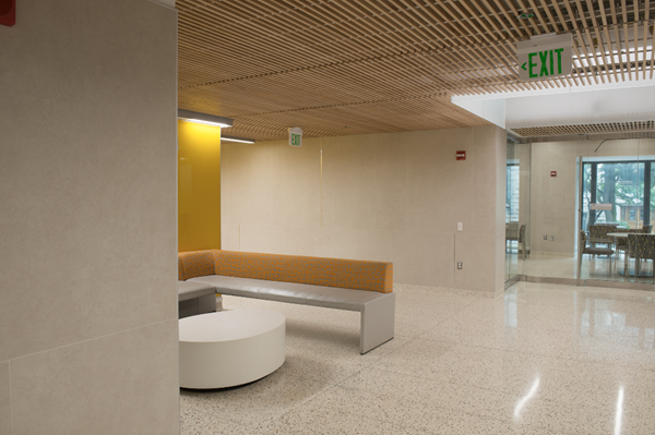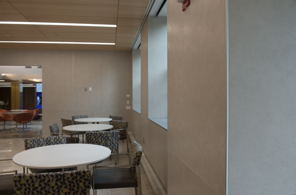 With flexibility as the key design element, the team chose Crossville Porcelain Tile Panels by Laminam for the wall surfaces in the classrooms and corridors of Kresge. “The tile panels provided us a thin, simple, and visually lightweight approach to wall surfaces in public areas that is durable and easy to clean in the most high-traffic areas of the building,” Lothan shares.