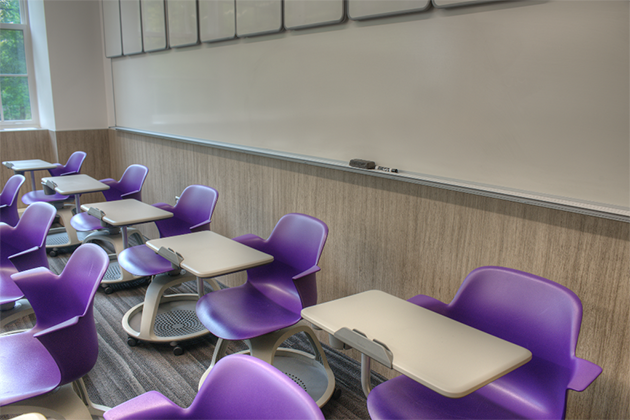 Based on input from the faculty of the College, the A&D team identified the central challenge of the project: create a modern facility that’s simple to update and reconfigure responsively to evolving needs at any given time. Previously, Kresge Hall’s classrooms accommodated only a traditional lecture room configuration, with seats for 28 students in forward-facing rows. In contrast, the new classrooms were created to allow for multiple configurations and a range of teaching methods and styles.
