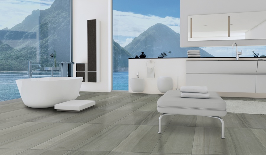 Cement-look Gotham porcelain floor tile offers subtle striations, aggregate finishes, and concrete colorations.