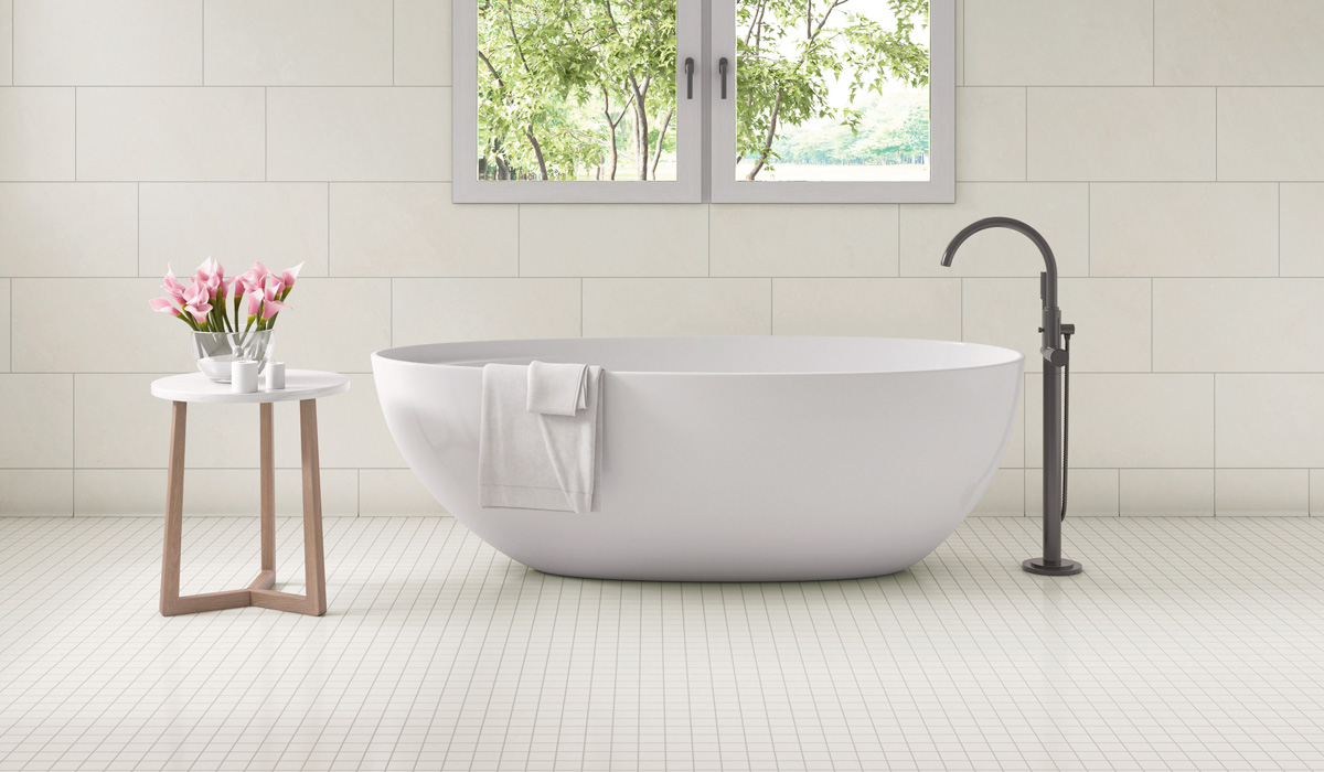 Additionally, Crossville’s Portugal collection is available in the stunning triangular mosaic that is sheet-mounted and ready for installation on floors and walls. The triangular mosaic works well for linear or centered drains on wet area floors or to create a stunning vertical focal point on the wall. For more traditional looks, the sheet-mounted 2”x2” mosaic is also available. Standard bullnose or cove base made from the same material as the field tile to ensure coordination are also included.