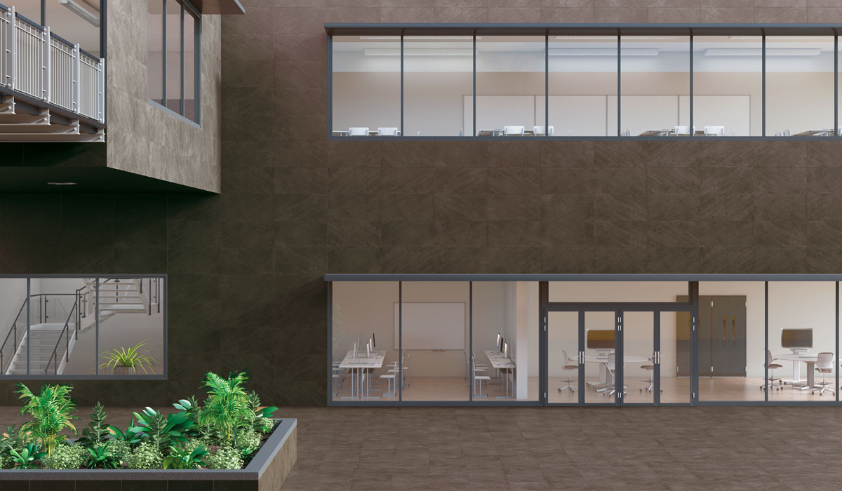 The interior field tile sizes range from the extremely large 24”x48” to 24”x24”, 12”x24” and 6”x24”, while the exterior tiles come in 12“x24” and 24”x24”. All sizes are rectified.