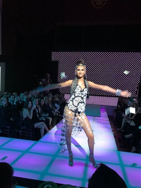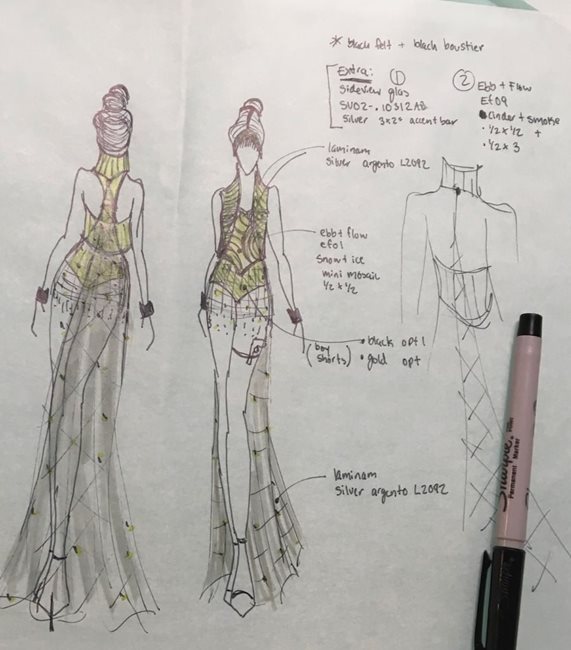 Our Bond Girl’s long, flowing train was handmade with metallic quatrefoil shaped waterjet-cut tile and sparkling crystals. Bejeweled wrist cuffs crafted from our mirrored Sideview Glass tile completed the glamorous look.