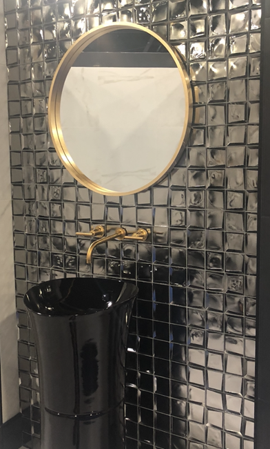 Our Sideview glass line is the stunning selection of choice for this year’s Installation Experience at the show. Designer Alena Capra who also serves as spokesperson for the Coverings show selected this sophisticated, jeweled look for her vignette.