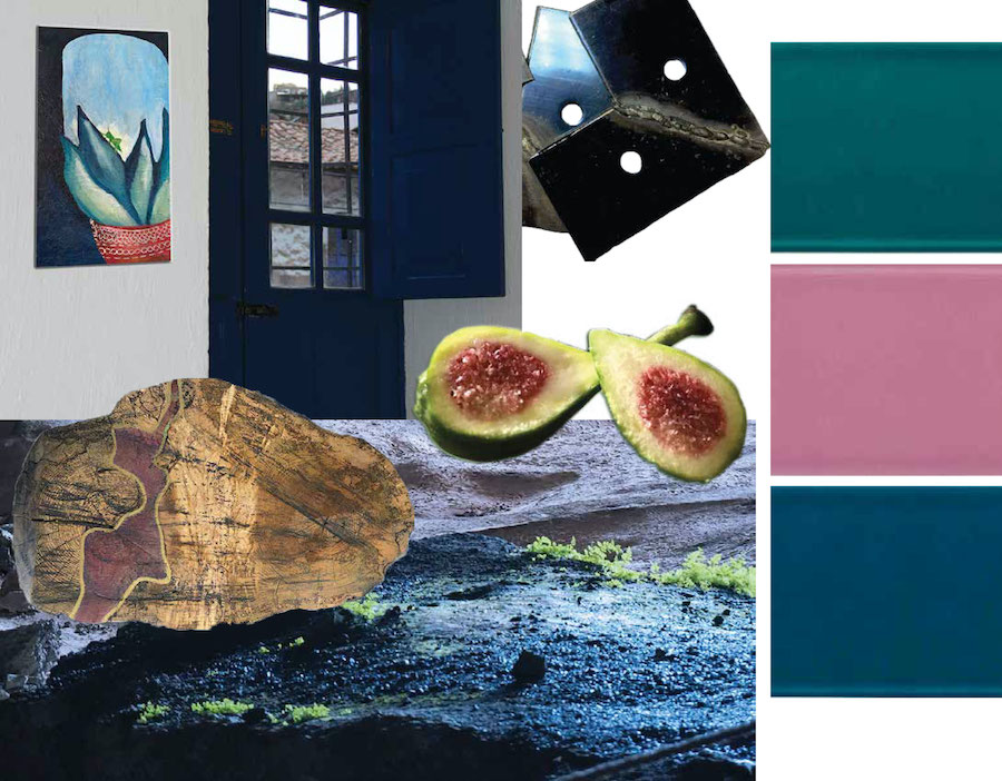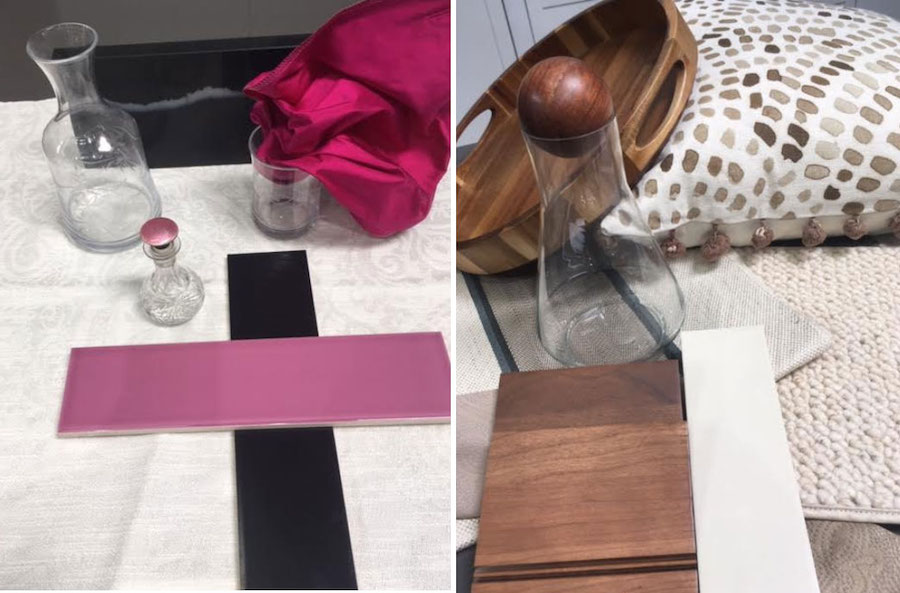 Pink tiles from the 50s that are still in many Southern California homes today remind Barbara of etched glass and pretty doilies. The mood board on the left “takes that and turns it a bit jazzier. Using a mulberry pink and pairing it with black creates a look too hot for Grandma!” Barbara envisions these tiles in a commercial bar environment.