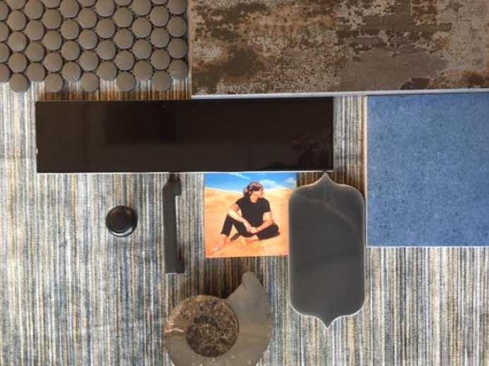 The board below takes inspiration from a mother-son trip from Tuscon, Arizona to San Diego. “Beautiful sand dunes lined one strip of highway. We impulsively parked and shot photos. My son wrapped a scarf around his head ,and the mood felt instantly transported to another land. I wanted to recreate that feeling through tile and counters and fabric.” Barabara says, “Swatches is perfect for the walls behind vanities to create a mood.”