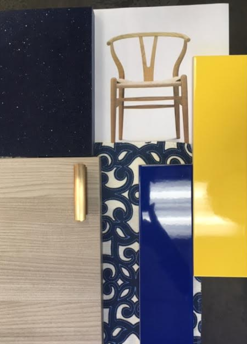 Barbara’s last board is inspired by Sweden, “their flag colors, of course, being yellow and blue coupled with the light furniture and clean lines.” She envisions the blue and yellow subway tiles in a kitchen backsplash.