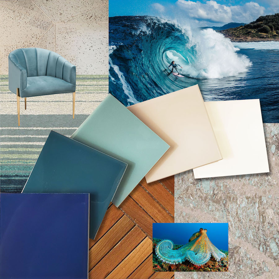 Noel’s second mood board takes its inspiration from Pantone’s Color of the Year, Classic Blue. She added tranquil and comforting materials to the blue hues to “hug our home” and “soften our ‘blue’ life.” Noel envisions these elements in an open kitchen area, “encompassing your family like a hug.”