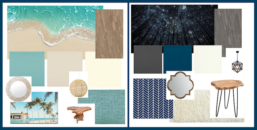 A “starry night sky” and a “warm and breezy laid-back Southern California beach” were the inspirations for Luis Padilla’s (with Longust Distributing) mood boards. Luis wrote, “Swatches can be used on various walls and backsplashes, in both kitchen and restrooms.”