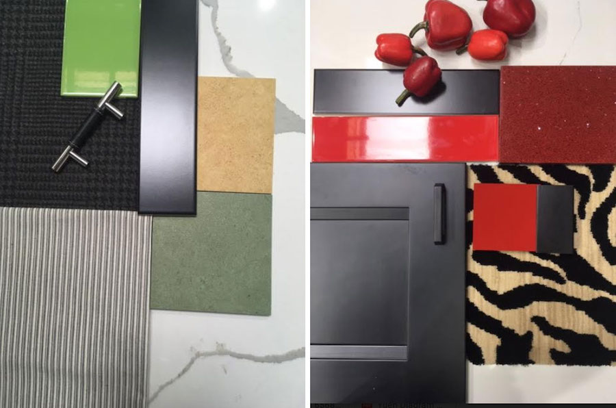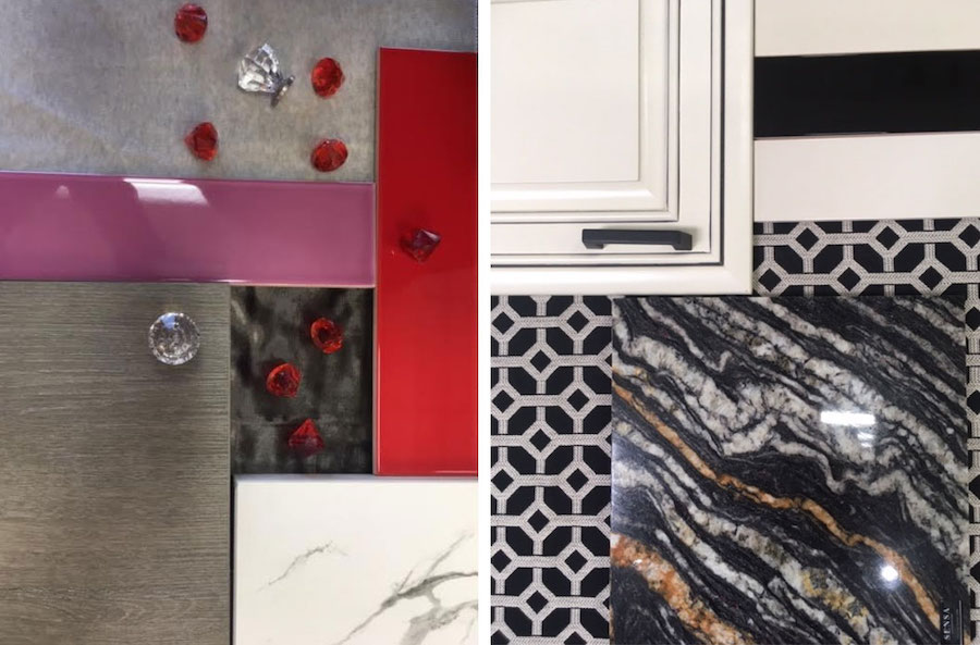 The board on the left was inspired by a dear friend of Barbara’s who was recently diagnosed with cancer. This is Barbara’s “what are you waiting for!! Yes, pick the red and pink” mood board. She envisions the vibrant red and pink in the bar area of a home.