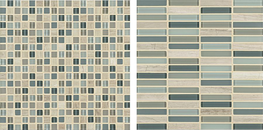 Ebb and Flow stone and glass mosaics have the illusion of three-dimensional patterning rendered in a smooth, “tromp l’oeil” surface, adding allure to this unique tile blend.