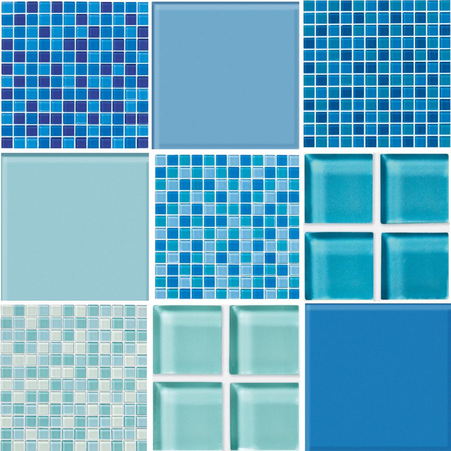 An array of Glass Blox mosaics with captivating sea and sky-inspired color names such as Agean, Blue Grotto, Mermaid, and Clear Sky.