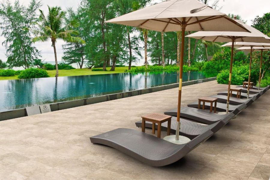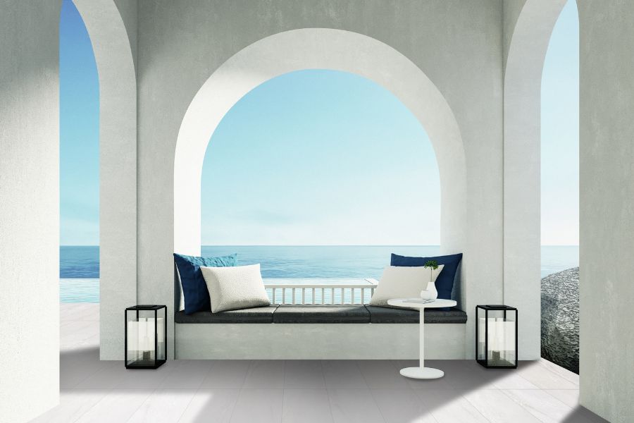 Natural stone looks in earthen hues are the perfect backdrop for coastal design schemes. Consider Owen Stone, Stone Fiction, and Portugal porcelain tile collections. These collections offer an outdoor porcelain paver option so that designs can flow seamlessly from indoors to outdoors.