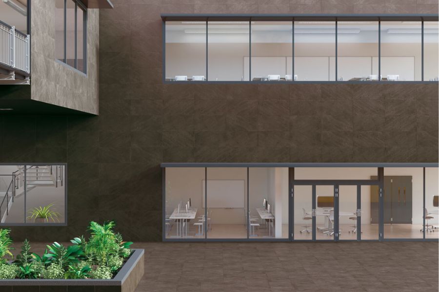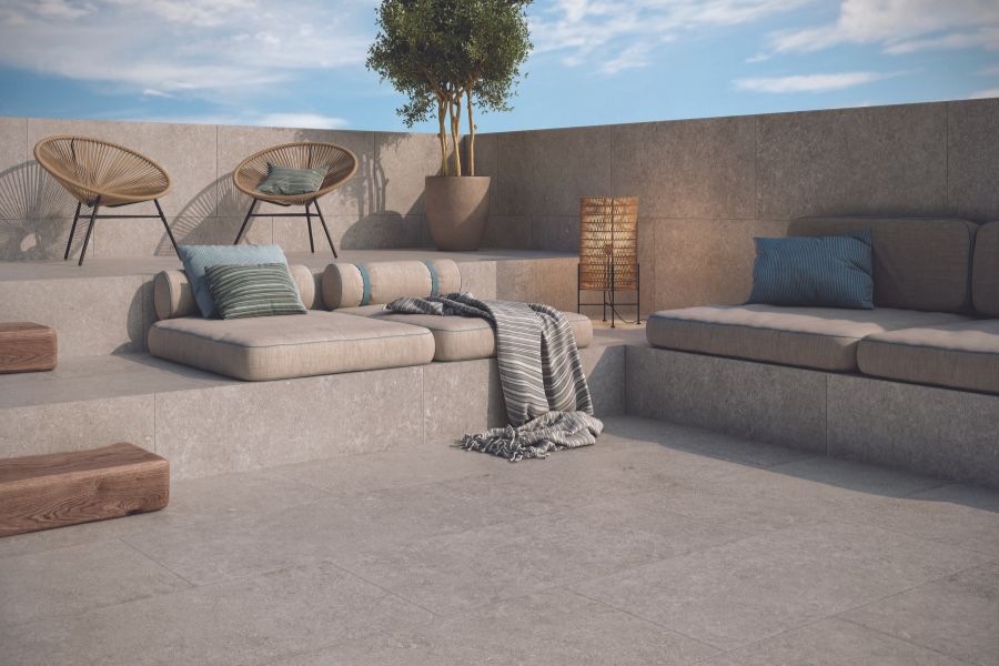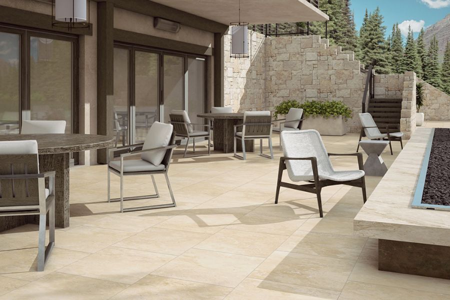 Explore our tile porcelain tile collections with an exterior finish (or grip finish) option. These stunning tiles mimic beautiful stones such as travertine, Italian Pietra di Cardosa, Portuguese Atlantic Dark limestone, and Belgian Bluestone. They are perfect for outdoor communal gathering spaces, dining areas, cafes, pool decks, patios, and more, in both commercial and residential spaces.
