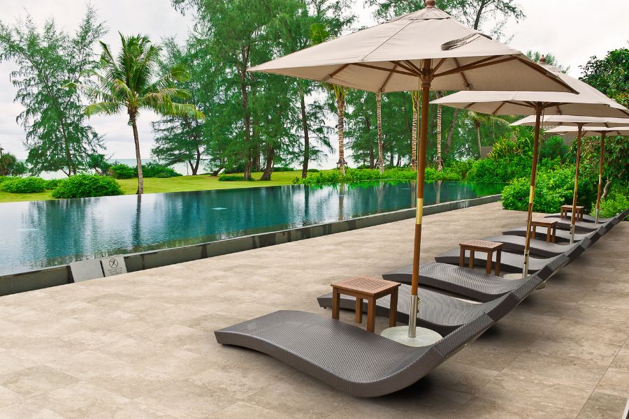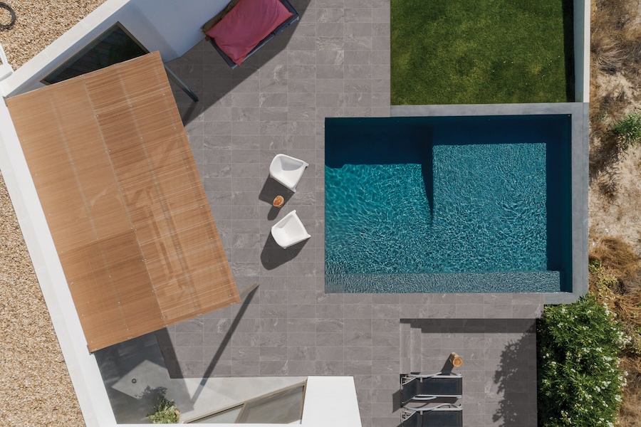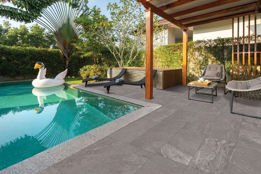 When it comes to tile flooring indoors and outdoors, slip resistance is always an important consideration, but it becomes even more important in outdoor environments. Unlike indoor flooring that may be subject to spills here and there, outdoor flooring can become very wet and potentially slippery from pool splashes or precipitation. Porcelain tiles are considered impervious (water does not penetrate them) and offer good traction when wet. Still, special finish exterior porcelain tiles offer even more traction in wet, outdoor environments — these are the exterior tiles with a textured finish for enhanced grip (sometimes called grip finish tiles).